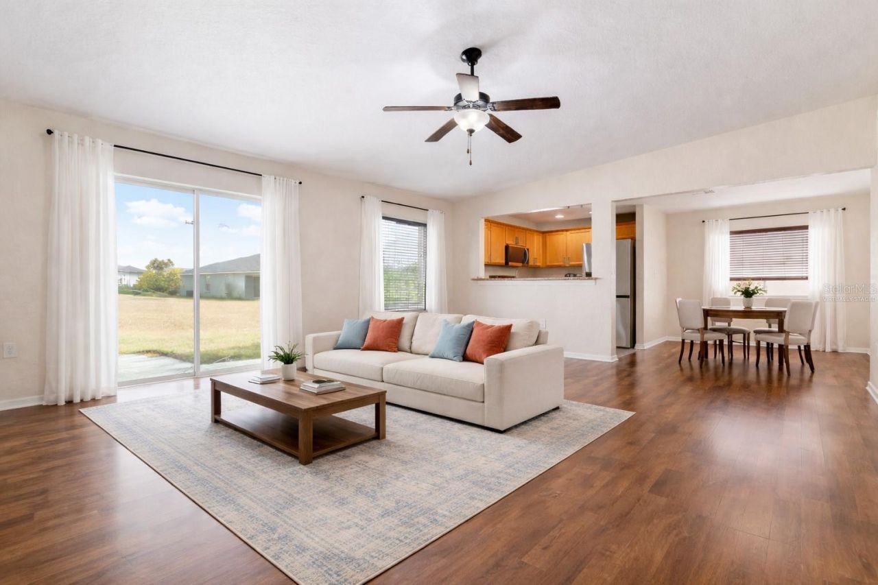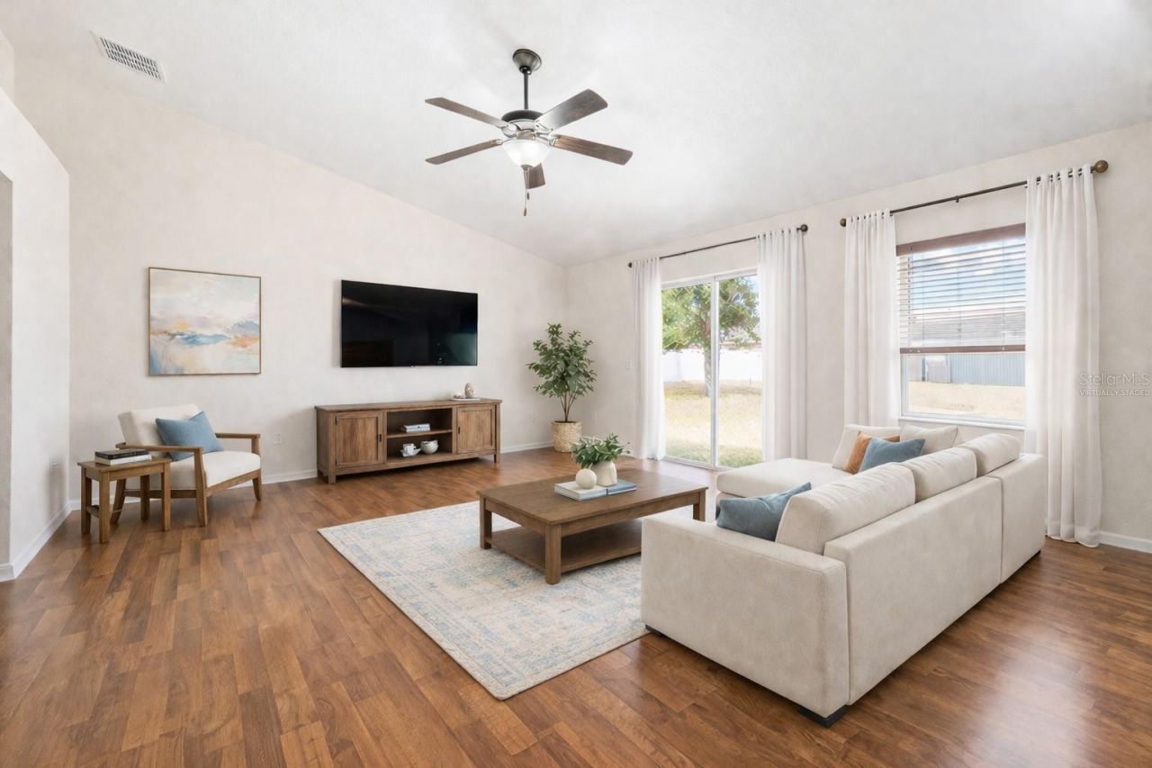 One or More Photos have been virtually staged. Located on a quiet cul-de-sac in the highly desirable Highland Meadows community, this immaculately maintained 3-bedroom, 2-bath, 1,371-square-foot home features a new 2025 roof, fully paid-off solar system, laminate floors, new stainless steel appliances, a split-bedroom layout, open floor plan, and a large backyard. As you enter the front door, you are greeted by an open-concept living room, kitchen, and dining room layout with beautiful laminate floors, vaulted ceilings, and large windows filling the space with natural light. The kitchen features granite countertops, a breakfast bar, and new stainless steel LG ThinQ appliances, including a convection oven and French-door refrigerator with a pull-out freezer. The primary suite features a spacious bathroom with dual sinks, a walk-in shower, garden tub, and large walk-in closet. Opposite the primary bedroom are the second and third bedrooms, along with a full bath featuring a tub/shower combo and glass enclosure. Through the laundry room is a two-car garage with an electric vehicle charging station and indoor controls for the Rain Bird irrigation system. With approximately 3,200 square feet of backyard space, it is a blank canvas ready for a pool, paver patio, or garden of your dreams. Replaced in 2025, the roof supports 30 solar panels, reducing the owner's average electricity bill to approximately $100 per month. The Highland Meadows neighborhood offers a friendly, peaceful setting, whether you enjoy sunset strolls down tree-lined streets in the evenings or hosting backyard barbecues for family and friends. With a low CDD and an unbelievably low HOA of just $25 per year, Highland Meadows offers incredible value. Conveniently located near major roads and highways, this home is just a short drive from all that Central Florida has to offer, including world-renowned Disney World, shopping centers, entertainment, and restaurants.