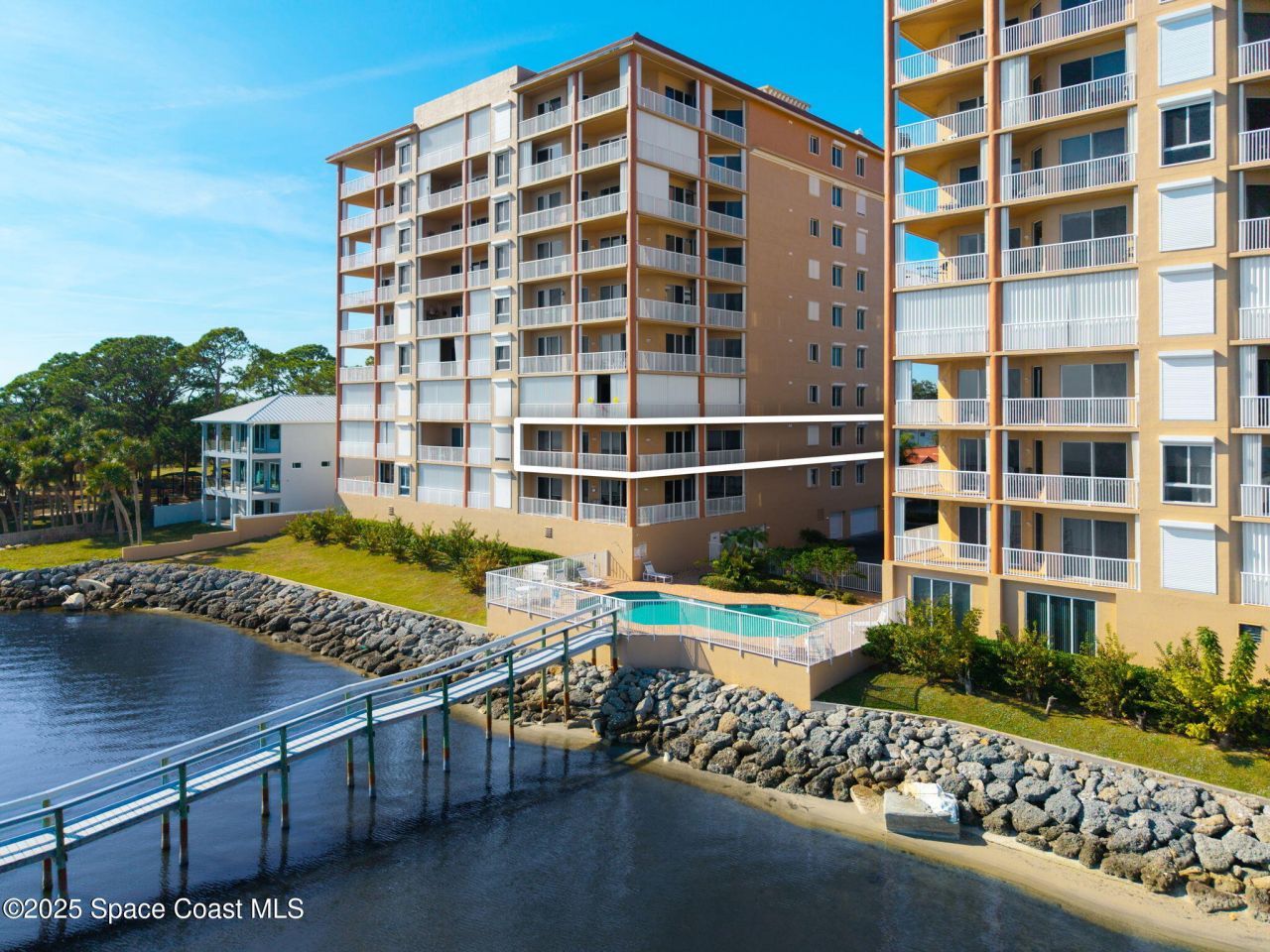 OUTSTANDING VIEWS across the Indian River with a literal front-row seat to the Kennedy Space Center?this riverfront corner unit puts every launch on full display! A brand-new roof, fresh interior paint, and a spotless, light-filled interior set the tone, while multiple sliders from the generous living and formal dining areas open to a wide balcony that captures those unbeatable water vistas. A columned formal living room creates an impressive entry moment, and the kitchen delivers with granite surfaces, breakfast bar, breakfast nook, and modern appliances. The primary suite elevates everyday living with private balcony access, two walk-in closets, a jetted tub, separate tiled shower, and dual sinks. Both guest bedrooms sit near full baths, and one even features a charming Juliet balcony facing lush palms. Added perks include washer and dryer, a gated community with interior lobby and elevators, plus a community pool, clubhouse, and dock for the complete waterfront lifestyle.