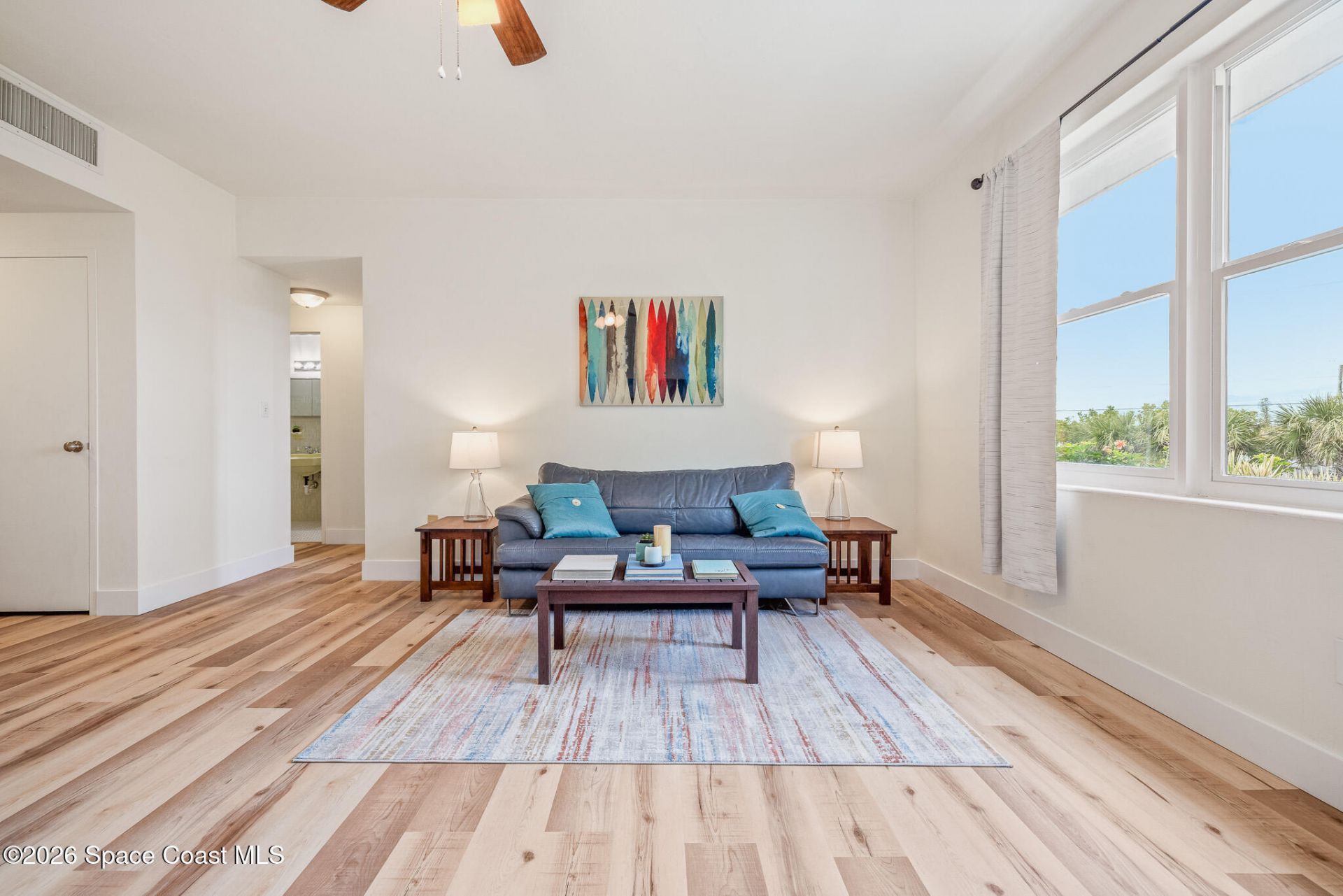 Wake up to the sound of waves in this beautifully remodeled 1 bedroom, 1 bath condo located directly across from the ocean in the heart of Satellite Beach. This second-floor retreat features new waterproof vinyl flooring, fresh paint and new baseboards in 2026, along with major updates including an AC handler, condenser, and water heater. Enjoy peace of mind with hurricane impact rated windows. Extra storage is available in a communal hallway room. Condo fees cover internet (currently being installed with completion expected in March at no added cost), water, sewer, trash, pest control, grounds maintenance, and insurance. Residents enjoy resort-style amenities including an Olympic-size pool, BBQ area, shuffleboard, basketball court, and recreation room. Assigned parking plus ample guest spaces add convenience. Best of all beach access is directly across the street.