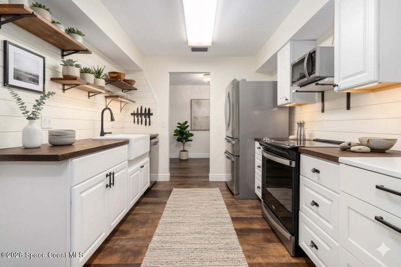 Updated ground floor 2-bedroom, 2-bath condominium with a private 1-car garage in a well-maintained, gated West Melbourne community with on-site management. This open floor plan features wood-look flooring throughout, fresh interior paint, and modernized appliances, including a new garbage disposal. The AC system was replaced in 2023, offering peace of mind and energy efficiency. The kitchen, dining, and living areas flow seamlessly and open to a fully screened lanai, accessible from both the living room and breakfast area through sliding glass doors. The patio floor has been freshly repainted, creating a clean and inviting outdoor retreat. Both bedrooms feature windows and updated fabric blinds. The primary suite offers a walk-in shower, walk-in closet, elevated commodes, and added safety features. A spacious indoor utility closet with washer and dryer adds everyday convenience. Additional highlights include four ceiling fans, updated guest bath fixtures, and thoughtful finishes